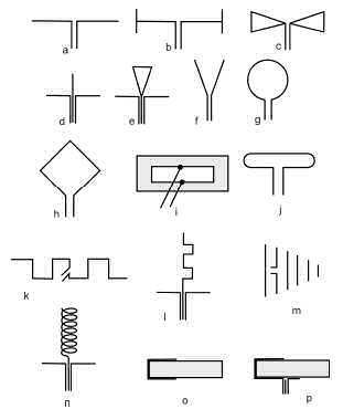a) Dipol b) Hertzscher Dipol c) Kegeldipol d) Monopol e) Konusantenne f) Winkeldipol g) kleine Schleife h ) Quad i) Langschlitz j) Faltdipol k) Bruce Antenne l) Franklin Antenne m) Yagi n) Wendelantenne o) Nahfeldlinse p Polyrodantene |