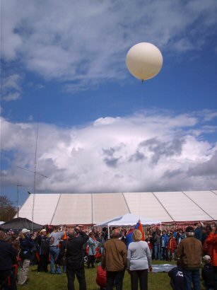Der Ballon kurz vor dem Start. Im Hintergrund das Bockbierfestzelt der Herbsthäuser Brauerei, die das Helium für den Start gesponsort hat.