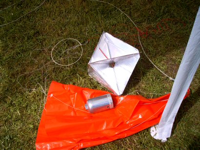 Der Radarreflektor, sowie der Fallschirm mit dem Spreitzring. Auf dem Fallschirm