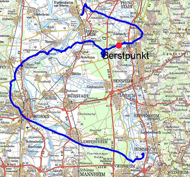 | Startkoordinaten: | 8,623°E 49,572°N (Weinheim OV-Gelände Wasserhaus) | ||