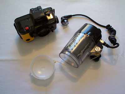 Unsere Kamera-Ausruestung besteht aus der Motomarine II EX, dem Blitz (YS-50) mit